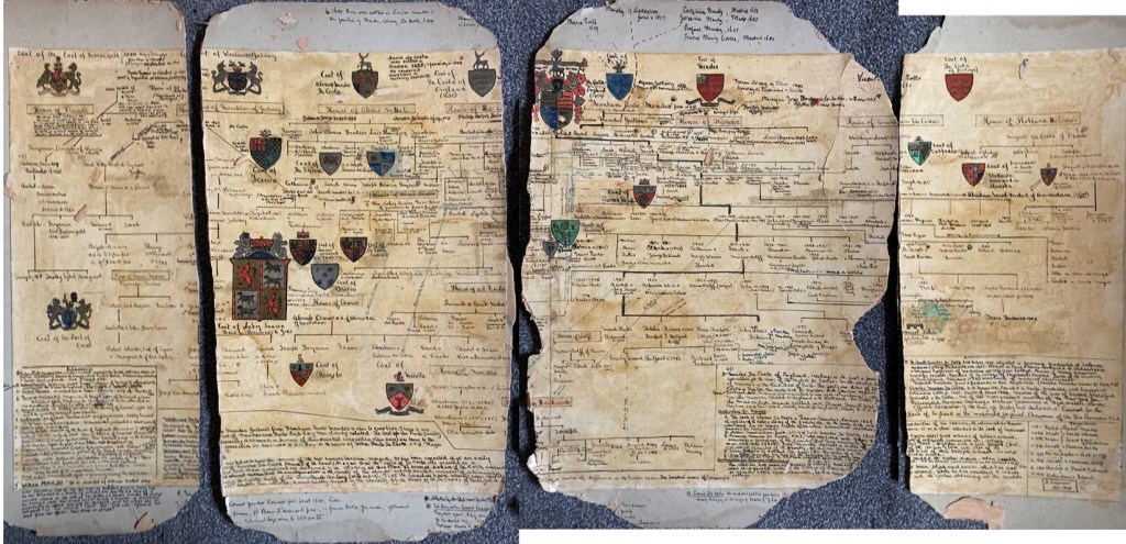 Figure 7 shows the forebears of this couple dating back to the 16th century. The tree is in four panels and has been severely damaged. The reason for this is that during the 2nd World War there was fear of a Nazi invasion and the tree would have shown the Jewish origins of the de Moraville family. It was thus broken into four pieces and hidden under the floorboards of Audrey’s house. The tree is now in the possession of Amanda Webb, her granddaughter.